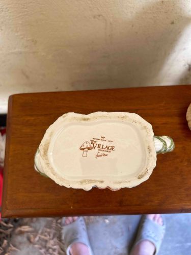 This is a vintage ceramic teapot base, specifically the 'Forest House' or similar cottage-style vessel from 'The Village Collectibles' series by Western House, dated 1978. The item is crafted from glazed ceramic, featuring a cream-colored body with intricate relief molding that simulates a rustic structure. Notable physical characteristics include an artisan-painted handle decorated with green vine-like accents and textured detailing. The bottom of the piece clearly shows a brown transfer hallmark featuring the series logo 'The Village Collectibles,' an illustration of a mushroom, and the text 'WESTERN HOUSE - 1978' along with a scripted artist's name, likely 'Annette' or similar. In terms of condition, there is visible cumulative shelf wear on the unglazed foot rim, manifesting as darkening and light scuffing. Minor crazing may be present within the glaze, typical for 1970s ceramics. The craftsmanship reflects the popular 'cottagecore' or whimsical folk-art style of the late 1970s. The piece appears to be missing its matching lid, which would typically complete the cottage design. Overall, the colors remain vibrant, and no major cracks or structural repairs are immediately visible in this view.