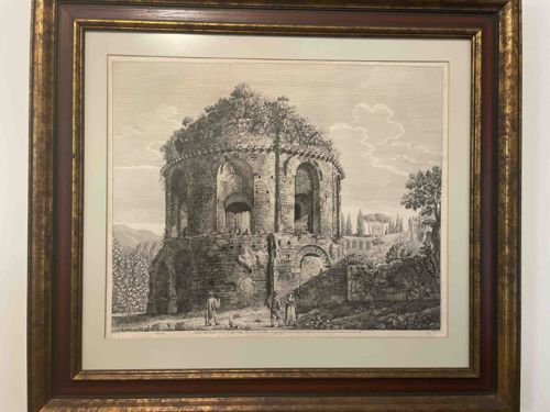 This item is a large-scale, monochrome copperplate etching or engraving depicting a classical Roman architectural ruin, specifically showcasing a weathered rotunda or mausoleum structure reminiscent of the 'Vedute di Roma' series. The artwork is characterized by high-contrast cross-hatching and fine linework, illustrating the decay of stone with overgrown flora atop the structure. Tiny figures populate the foreground to provide a sense of monumental scale. The print is housed in a sophisticated multi-component frame consisting of a wide gold-leafed outer molding with a distressed patina, a central mahogany-colored wood fillet, and an inner gold-toned sight edge. The work is professionally matted with a cream-colored acid-free mat. While the 'General Electric' context is provided, it likely refers to a corporate collection provenance rather than manufacture. The condition appears stable with no visible foxing or water damage on the paper, though there are minor abrasions and age-related wear to the frame's gilded surfaces. The piece displays the Neoclassical aesthetic of the late 18th to mid-19th century, reflecting the Grand Tour tradition of documenting Italian antiquities through detailed printmaking.