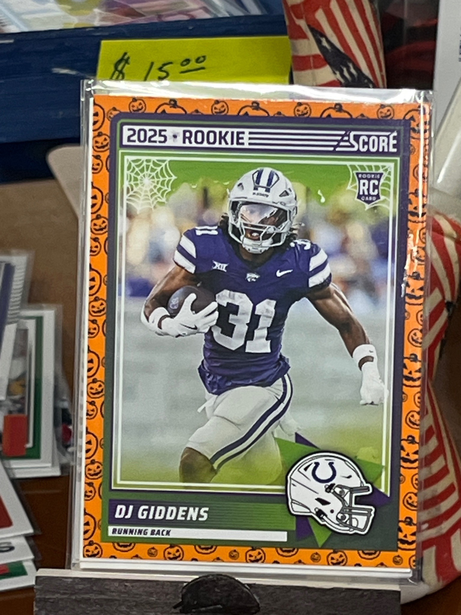 This is a 2025 Score Football rookie trading card featuring DJ Giddens, a running back for Kansas State (depicted in his collegiate uniform carrying the football). The card is a limited-edition 'Halloween' or 'Pumpkin' parallel, characterized by its vibrant orange border filled with repeating jack-o'-lantern illustrations. The main image is framed with a secondary green and purple color scheme, featuring a cobweb motif in the upper left corner and the 'RC' rookie logo in the upper right. At the top, it bears the '2025 ROOKIE' designation and the 'SCORE' brand logo. In the bottom-right corner, there is an illustrated Indianapolis Colts helmet, indicating the player's NFL affiliation. The card is physically standard size (2.5 x 3.5 inches), constructed from typical glossy cardstock. It appears to be in Excellent/Near-Mint condition, housed in a Protective clear poly-sleeve and a rigid top-loader. The centering appears slightly top-heavy, and no surface scratching or corner blunting is immediately visible through the protective layering. This specific parallel belongs to the modern era of sports card collecting, specifically a 2024-2025 release cycle targeting seasonal collectors.