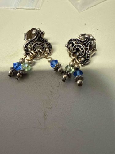 This pair of earrings features a chandelier-style drop design crafted from antiqued silver-toned metal, likely sterling silver based on the finish and oxidation patterns. Each earring consists of a decorative scrolling post-top with rope-texture detailing and granulation work. Suspended from the base are three distinct dangles. The 'unknown stones' mentioned are identified by their bicone cut and high transparency as multi-colored Swarovski crystal beads in cobalt blue and seafoam green hues. These are accented by round silver beads and small floral-shaped spacer plates at the base of each drop. The metal showcases a heavy patina, especially within the recessed scrollwork, which provides a high-contrast aesthetic typical of Bali or Southwestern-inspired jewelry. There are visible signs of wear consistent with age, including surface scratches and significant tarnish on the butterfly clutches and wire stems. The construction suggests late 20th-century artisan production (circa 1980s-1990s), emphasizing bohemian or eclectic styles. No specific maker's mark is visible in the provided image, but the precision of the cast elements and the consistent facet quality of the bicone crystals indicate mid-to-high quality costume or boutique jewelry craftsmanship.