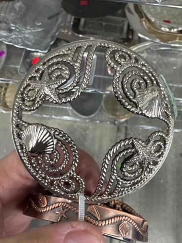 This is a decorative metal candle accessory set featuring a nautical or coastal motif. The item consists of two pieces: a circular 'Illuma-Lid' jar topper and a corresponding base ring. The topper is finished in a polished silver or nickel-plated metal, featuring an intricate openwork filigree design. This design incorporates alternating seahorse-like swirls, textured starfish, and fan-shaped scallop shells, all framed within a raised rope-border edge. The topper is slightly domed with a central ventilation hole designed to stabilize the flame and improve the burn quality of a large jar candle. The accompanying base ring is finished in a contrasting brushed copper or bronze-toned metal, embossed with a similar rope and seashell pattern. In terms of condition, the silver topper shows minor surface scratches and slight tarnishing in the crevices of the textured rope design, while the copper base exhibits a darker patina, likely from heat exposure or age. A plastic zip-tie is currently holding the two pieces together. These pieces were likely manufactured by or for Yankee Candle around the early to mid-2000s and represent mass-market home fragrance accessories valued for their functional utility and decorative appeal.