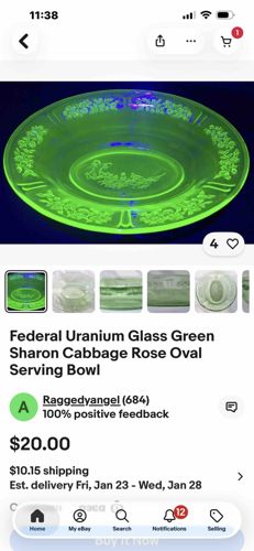 Federal Glass Company Sharon Cabbage Rose Uranium Glass Oval Serving Bowl