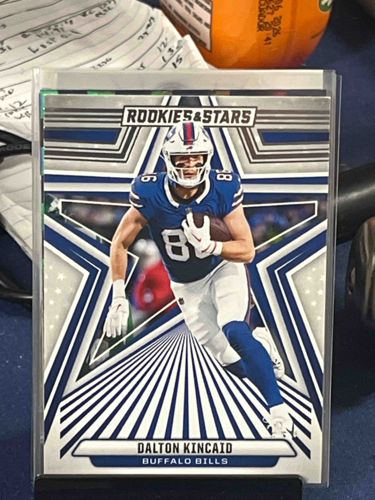 This is a modern sports trading card featuring Dalton Kincaid of the Buffalo Bills, produced as part of the 2023 Panini Rookies & Stars collection. The card displays a dynamic action shot of Kincaid in his blue Buffalo Bills jersey and white pants, carrying a football. The card design is characterized by a prominent large star border centered behind the athlete, with radiating white and blue 'speed lines' extending from the bottom. The top of the card features the 'ROOKIES & STARS' logo in a bold serif font, while the player's name and team are clearly printed at the bottom. The physical construction consists of standard 35pt cardstock with a glossy finish and reflective chrome-like accents typical of Panini's high-end printing. Regarding condition, the card appears to be housed in a protective soft sleeve and a rigid top-loader, suggesting a high state of preservation with sharp corners and clean edges visible through the plastic. The centering appears well-balanced. As a 2023 release, the card is in excellent condition with no visible surface scratches, creasing, or edge wear. This specific series is known for its high-quality foil stamping and detailed photography, making it a desirable item for NFL memorabilia collectors.