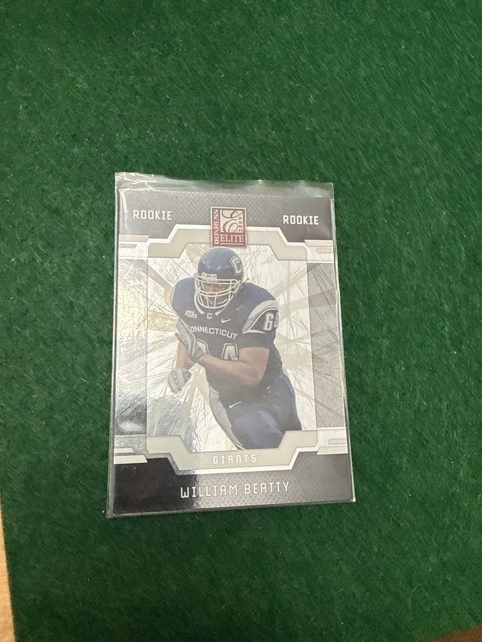 This is a 2009 Donruss Elite football trading card featuring William Beatty, an offensive tackle from the University of Connecticut, who was drafted by the New York Giants. The card is a standard 2.5 by 3.5-inch rectangular trading card made of cardstock with a high-gloss, premium finish. The design features a central action photograph of Beatty in his blue and white UConn Huskies collegiate uniform, framed by a modern, architectural grey and silver geometric border. In the upper center, the 'Donruss Elite 2009' logo is prominently displayed, flanked by the word 'ROOKIE' in a sans-serif font. The bottom of the card lists his professional team as 'GIANTS' above his name, 'WILLIAM BEATTY', which is printed in a stylized white font. The background behind the player has a reflective, radial linear pattern that creates a sense of motion. The card is currently housed in a clear protective plastic sleeve (penny sleeve). Regarding condition, the card appears well-centered with sharp corners and clean edges visible through the sleeve, with no obvious surface scratches or creases, suggesting it has been well-maintained. This card is part of a series known for its high-end production quality and was manufactured by Panini (under the Donruss brand).