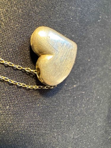 This item is a dimensional 'puffy' heart pendant suspended on a fine link chain. The heart features a prominent rounded, convex three-dimensional form, typical of mid-to-late 20th-century costume jewelry styles. Its surface is characterized by a distinct brushed or satin matte finish, which creates soft light diffusion rather than a high-reflective mirror shine. The metal appears to be a gold-tone alloy or gold-plated base metal, exhibiting a warm yellow hue. The pendant is constructed as a slider style, with the chain passing directly through a lateral aperture in the upper lobe of the heart rather than using a traditional external bail. Regarding condition, the piece shows visible surface wear including fine linear scratches and minor scuffs consistent with frequent use and contact with the chain. There is a slight darkening or patina in the recessed areas, which may indicate silver-gilt (vermeil) or simply age-related oxidation of a base metal. The accompanying chain is a classic cable link design, which appears delicate in proportion to the weight of the pendant. No designer hallmarks or karat stamps are visible from this primary angle, suggesting it may be a boutique costume piece or a minimalist contemporary design dating from the 1980s to the early 2000s.