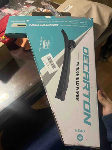 This item is the retail packaging for a Decarton brand windshield wiper blade, designed for automotive use. The packaging features a distinctive teal, white, and black color scheme on a cardstock or cardboard substrate. It is uniquely shaped with a wide base that tapers towards the top, likely to accommodate the specific curvature and mounting bracket of the beam-style wiper blade pictured on the front. The box prominently displays the 'DECARTON' brand name in a bold, stylized sans-serif font. Key marketing features listed on the box include 'QUITE', 'DURABLE', 'COLD RESISTANT', and 'HEAT RESISTANT'. The phrase 'PREMIUM QUALITY AUTO PARTS' reflects the manufacturer's quality claims. Explicit manufacturing information includes a 'MADE IN CHINA' stamp. The packaging shows signs of minor handling wear, including softening of the corners and slight creasing along the edges, common for consumer goods in a shipping or warehouse environment. An Amazon-style barcode sticker is affixed to the front, indicating modern logistics and contemporary distribution. This is a mass-produced consumer automotive accessory, likely manufactured within the last 1 to 5 years. The craftsmanship is standard for industrial commercial packaging, utilizing offset printing and die-cut folding assembly.