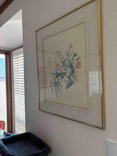 This item is a large-format framed botanical art piece featuring a central arrangement of wildflowers. The artwork is likely a lithographic or offset print on paper, characterized by a soft palette of muted peach, coral, and teal-blue tones against a light cream or off-white background. The composition is loose and naturalistic, reminiscent of late 20th-century decorative interior art, specifically the 1980s to early 1990s aesthetic. It is professionally housed in a thin-profile, gold-toned metallic frame with a polished finish. The matting is a significant design element, featuring a double-mat style with decorative 'French line' detailing or a secondary colored inner border that creates a sense of depth around the image. The glass or acrylic glazing shows noticeable reflections, typical of standard non-museum grade protection. Historically, this style of art flourished in suburban home decor, and while no specific artist's signature is visible from this angle, pieces of this scale were often mass-produced for high-end furniture or home goods retailers. The overall condition appears excellent with no visible foxing, water damage, or fading of the pigments, although some light surface dust is present on the frame. The sheer scale and multi-layered matting indicate a quality framing job designed to serve as a focal point in a residential interior.