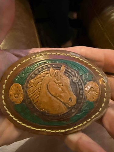 This item is an oval-shaped, hand-tooled leather belt buckle featuring a central relief of a horse's head in profile. The buckle displays a rich multi-toned color palette, utilizing shades of warm tan for the primary horse motif and flanking floral elements, complemented by a deep forest green background and a dark brown outer border. The construction involves a layered leather approach, with thick perimeter stitching in a contrasting yellow-gold thread that provides structural integrity and aesthetic framing. The horse's mane and facial features are intricately carved, demonstrating folk-art craftsmanship common in Western-style leatherwork from the late 20th century, likely the 1970s or 1980s. To the left and right of the central medallion are carved floral motifs resembling wild roses or poppies. The condition appears well-preserved with a natural aged patina; however, slight scuffing and minor surface wear are visible along the outer edges, consistent with moderate use. There are no visible maker's marks on the front, suggesting it may be a custom artisan piece or a high-quality hobbyist creation. The tooling depth indicates a sturdy piece of saddle-weight leather bound to a rigid internal or rear support structure typical of decorative belt hardware.