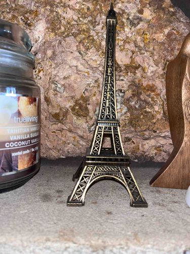 This is a small decorative figurine modeled after the Eiffel Tower in Paris. The item is constructed from a zinc alloy or similar cast metal, featuring an antiqued bronze or brass-toned finish with dark patination in the recessed lattice areas to create visual depth. Its design follows the classic three-tier architecture of the tower, including the arched base and tapering spire. A notable feature is the vertically oriented text 'TOUR EIFFEL' cast into one side of the upper section. The construction appears to be a mass-produced cast molding, characterized by slightly rounded edges on the lattice work. The condition shows signs of surface dust and light oxidation, consistent with a decorative object kept on a shelf, but no structural damage or missing components are visible. This type of souvenir is a contemporary piece commonly found in tourist markets in France or home decor stores worldwide. The craftsmanship is standard for souvenir-grade collectibles, focusing on recognizable iconography rather than fine detail. It stands approximately 15-20 centimeters tall based on proportions relative to the surrounding candle jar and natural stone background.