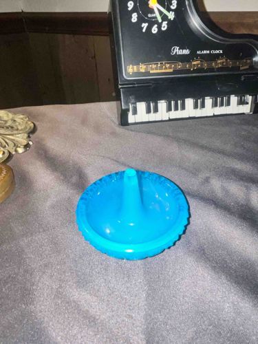 This is a vintage ring holder crafted from vibrant turquoise-colored pressed glass. The item features a classic circular base tray with a tall, tapered central spindle designed to hold multiple rings securely. The exterior rim of the base tray exhibits a decorative scalloped or notched pattern, which provides both visual texture and a stylistic reference to Mid-Century Modern or Art Deco design influences. Physically, the glass appears to be dense and opaque, similar to Mid-Century 'Milk Glass' or 'Slag Glass', with a high-gloss finish. The turquoise hue is consistent throughout the piece. Regarding its condition, the item shows some signs of surface dust and minor age-related wear, but no visible chips, cracks, or significant abrasions are present in the provided view. The craftsmanship displays smooth molding lines on the central post, indicating a quality mass-production process likely from the mid-20th century, approximately 1950s to 1970s. There are no immediately visible maker's marks from this angle, though similar pieces were often produced by companies such as Fenton or Westmoreland. The item serves as both a functional vanity accessory and a collectible piece of decorative glassware.