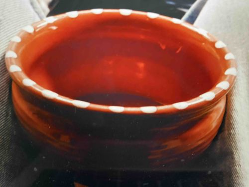 This item is a small, hand-painted ceramic bowl or salt cellar from the Block Gresval collection, likely manufactured in Portugal. The piece features a rich, deep terra-cotta or burnt-orange high-gloss glaze across both its interior and exterior surfaces. Structurally, it is designed with a rounded, squat body and a distinctive thick, flat rim that extends slightly past the base circumference. The most prominent decorative feature is a series of hand-painted, uniform white semi-circles or 'scallops' along the top of the rim, creating a repeating dotted pattern. In terms of condition, the glaze appears vibrant with no visible crazing, although some surface glare makes a definitive crack assessment difficult. There is slight visible wear consistent with vintage kitchenware, including minor glaze thinning on the outer edges and light scuffing on the lower body. Based on the style and manufacturer context, this piece dates to the late 20th century, specifically the 1980s or 1990s. The craftsmanship is indicative of high-quality mass-produced artisanal stoneware, characterized by heavy construction and a rustic, Mediterranean aesthetic.