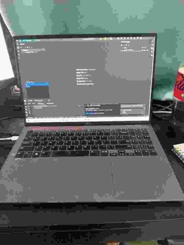 This item is an LG Gram 17-inch laptop, identifiable by its ultra-thin profile, expansive display with slim bezels, and distinctive 'LG' branding situated on the bottom bezel of the screen. The device features a dark gray or charcoal metallic-finish chassis, likely constructed from a magnesium alloy to maintain its signature lightweight characteristic. It includes a full-sized chiclet-style keyboard with a dedicated numeric keypad on the right and an integrated trackpad that is off-center to the left. The screen is active, displaying a dark-themed integrated development environment (IDE) or coding application, suggesting functional internal hardware. Regarding condition, the palm rest areas show visible surface marring, oils, and smudges from frequent use, though no major structural cracks or screen damage are immediately apparent in the low-resolution image. The hinge mechanism appears sturdy as it holds the large display at a fixed angle. This model likely dates from 2020-2023, representing a modern ultra-portable productivity machine known for high build quality despite its light weight.