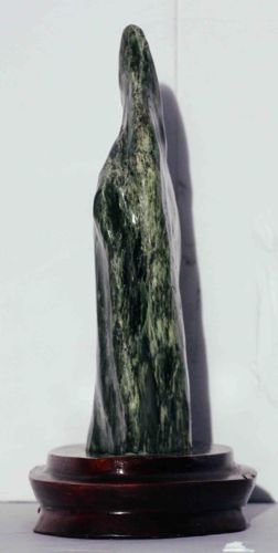 This item is an abstract, elongated vertical sculpture carved from a dense, variegated green stone, likely nephrite jade or high-quality serpentine. The piece stands on a circular, multi-tiered dark-stained wooden base, possibly rosewood or mahogany. The sculpture features a highly polished surface that showcases a rich color palette ranging from deep forest green to pale, minty streaks and mottled black inclusions, typical of natural metamorphic stone. Physically, it measures approximately 8 to 12 inches in height. The form is minimalist and biomorphic, suggestive of a shrouded human figure or a flame, with smooth, fluid contours that transition into a rounded, tapering peak. There are no visible maker's marks or signatures, which is common for mid-to-late 20th-century decorative lapidary art. The condition appears excellent with a high-gloss luster, though the wooden base shows minor surface scuffs and general age-related patina. The craftsmanship reflects skilled lapidary work, utilizing the natural grain and 'flow' of the stone to enhance the abstract composition. Its style is consistent with Mid-Century Modern organic abstraction or traditional East Asian 'scholar's stones' updated with a modern sculptural sensibility.
