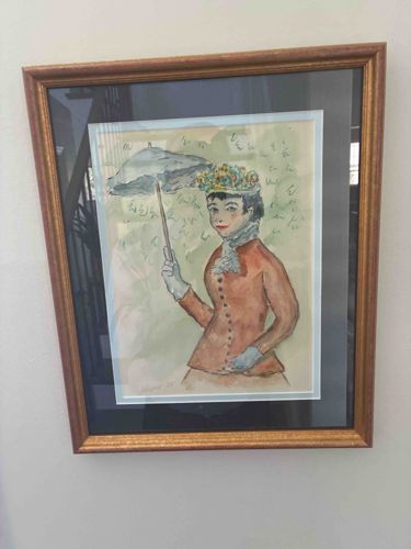 This is an original framed work of art, identified as a watercolor and ink piece by the artist Truxton Hosley (mid-20th century). The composition features a stylized portrait of a woman in vintage attire, reminiscent of late 19th-century fashion. She wears a rustic orange or terra cotta colored jacket with decorative buttons, a floral-embellished hat, light blue gloves, and a ruffled white collar, and she holds a grey parasol aloft. The background consists of loose, gestural green and tan washes with subtle calligraphic markings or script-like scribbles. The piece is signed 'Hosley' in the lower left corner. The artwork is presented under glass in a professional double-mat setup with a black outer mat and a white inner accent mat, providing high contrast. The frame is a simple classic gilt-finished wood with a subtle wood grain pattern. The overall condition appears excellent with no visible foxing, water damage, or fading to the pigments. The line work is confident and loose, characteristic of Hosley's illustrative style. This piece likely dates from the 1950s to 1970s, reflecting a mid-century interest in Victorian-era motifs through a modern lens.