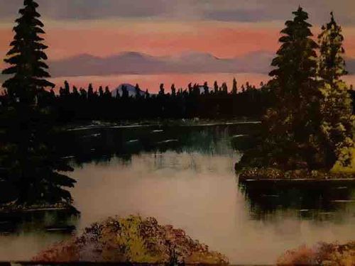 This is a horizontal landscape painting depicting a tranquil wilderness scene at twilight or dawn. The composition features a still body of water in the mid-ground, reflecting the pink and lavender hues of the sky above. Tall evergreen trees flank the left and right foreground, rendered in dark silhouette with thick, textured brushwork. In the far background, a dense forest treeline is visible beneath soft, rolling mountains. The color palette is dominated by dark greens, blacks, and browns in the foliage, contrasted against the warm pastel gradients of the sky. The work appears to be an oil or acrylic painting on canvas or board, utilizing a wet-on-wet technique similar to folk art or instructional painting styles of the late 20th century. Notable features include the heavy impasto on the foreground trees and the smooth, blended transition in the sky. The condition appears fair with some visible softening of details, though no major tears or paint loss are immediately apparent from the image. The craftsmanship suggests a dedicated hobbyist or emerging artist influenced by Bob Ross-style landscapes, likely dating from the 1980s to the present. The absence of a visible signature in this view may indicate it is an unsigned study or that the signature is located in a corner not fully captured.