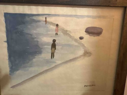This is a mid-century modern style watercolor painting on paper, housed in a simple wooden frame. The artwork depicts a minimalist coastal scene featuring three small figures standing at the shoreline where the deep blue water meets the sandy beach. The composition utilizes a slanted diagonal perspective, creating a wide expanse of sand in the foreground and a large rock or boulder on the right side. The color palette is composed of muted blues, sandy beiges, and earthy browns, applied with broad, fluid washes characteristic of the watercolor medium. There is a visible signature in the lower right corner that appears to read 'PANETTI' in capital block letters. The painting is mounted behind glass with a visible mat board. Regarding condition, the paper shows signs of age-related yellowing (toning), particularly around the edges of the mat, and the paper itself appears slightly wavy or rippled, which often occurs due to humidity or improper mounting. The frame is a dark-stained wood with natural grain visible, showing minor surface wear. The overall aesthetic suggests an original work from the mid-to-late 20th century, leaning towards an Impressionist or decorative illustrative style that prioritizes mood and simple shapes over fine detail.