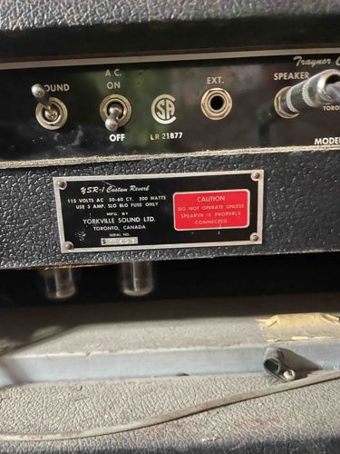 This is a vintage Traynor YSR-1 Custom Reverb guitar amplifier head, manufactured by Yorkville Sound Ltd. in Toronto, Canada. This specific unit features a robust construction typical of the late 1960s to early 1970s, characterized by its heavy-duty black 'elephant hide' Tolex covering over a wooden cabinet. The rear control panel is finished in black and white with metal toggle switches for 'Ground' and 'A.C. On/Off,' alongside an external speaker jack and a primary speaker output connected via a 1/4 inch cable. A notable feature is the CSA (Canadian Standards Association) logo and listing number LR 21877. The riveted manufacturer's plate identifies the model as YSR-1, specifying 115 Volts AC, 50-60 CY, and a 200 Watts power consumption rating. Below the chassis, vacuum tubes are visible, indicating this is a tube-driven circuit. The unit shows signs of vintage wear including surface dust, minor scuffs on the Tolex, and slight oxidation on the metal components. A prominent red 'CAUTION' sticker warns against operating without a connected speaker, a critical instruction for preserving the output transformer in such tube amplifiers. This model is well-regarded for its point-to-point hand-wired construction and durability.