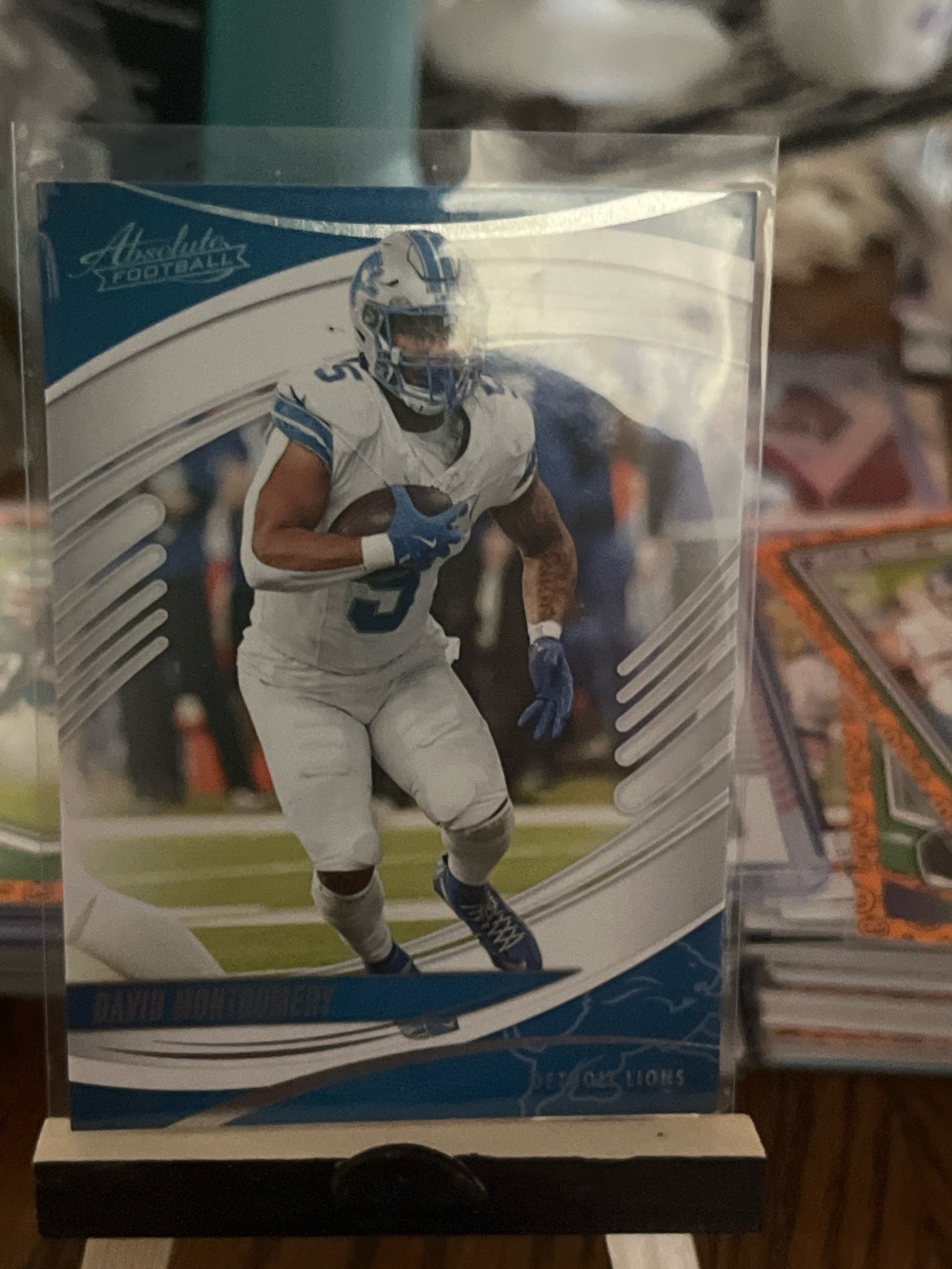 This is a 2023 Absolute Football trading card featuring David Montgomery of the Detroit Lions. The card follows the standard 2.5 by 3.5 inch format and is constructed from premium cardstock with a glossy, multi-layered finish. The aesthetic is dominated by the Lions' 'Honolulu Blue' and silver color scheme. The design features a high-action photography layout with Montgomery running in his white away jersey against a blurred stadium background. Surrounding the player are metallic silver swooshing graphic elements and die-cut-looking ridges that are characteristic of the Absolute Football brand. The 'Absolute Football' logo is present in the top left corner, while Montgomery's name is located on a blue ribbon footer alongside the team name 'DETROIT LIONS'. The card appears to be in excellent condition, housed within a protective soft sleeve and top loader, which has prevented surface scratches or corner blunting. There are no visible chips to the blue borders, and the centering appears consistent with factory standards. This is a base set card from the 2023 production year, showcasing high-quality modern printing techniques and holographic-adjacent silver foil accents.