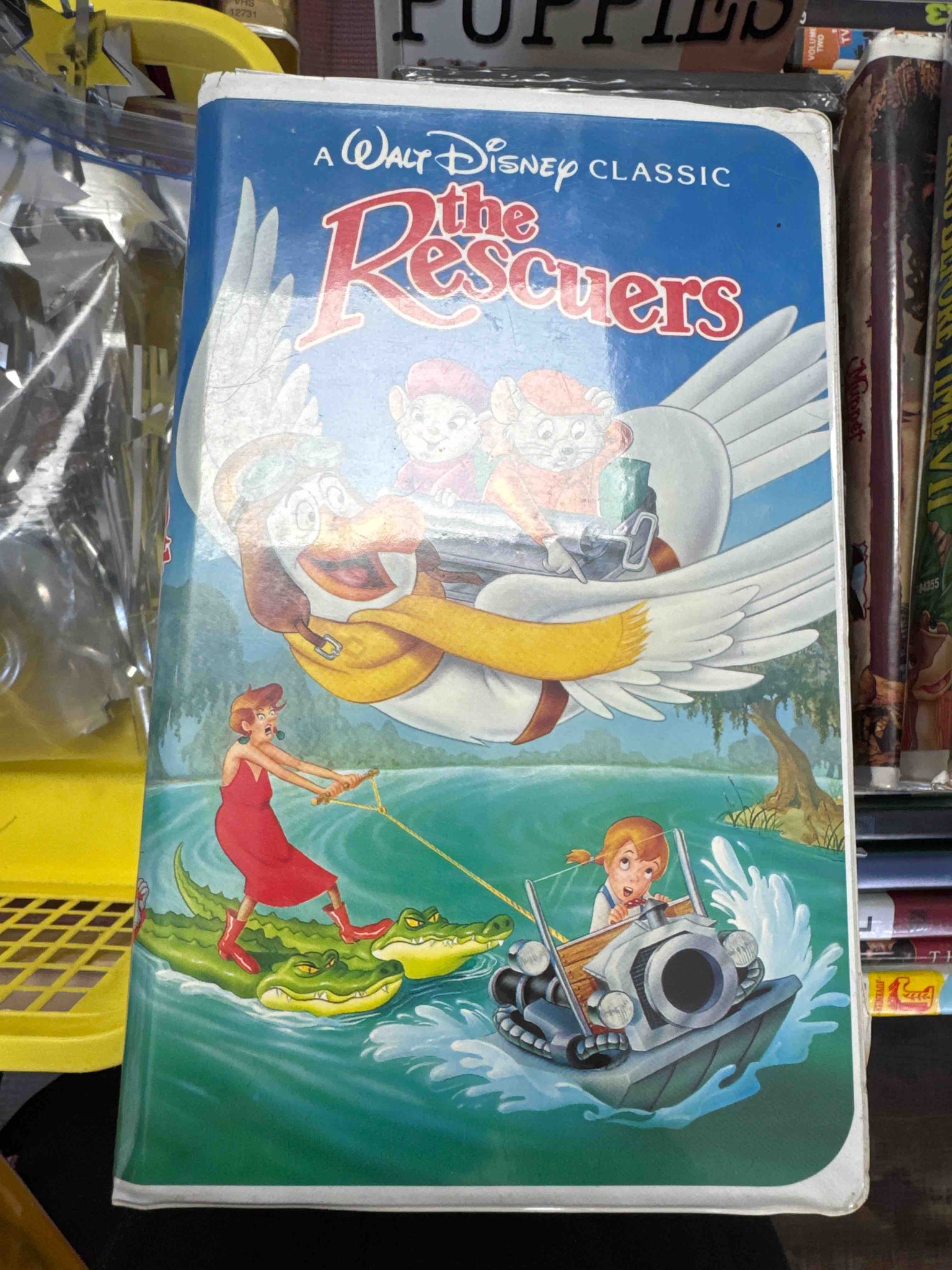 This item is a vintage VHS copy of Walt Disney's 'The Rescuers,' originally released in theaters in 1977. This specific home media edition belongs to the 'Walt Disney Classics' collection, famously identifiable by the 'Black Diamond' logo located on the spine of the case. The item is housed in a standard white plastic 'clamshell' case, which was the signature packaging for Disney's premium home video releases during the late 1980s and early 1990s. The front cover art features a vibrant, multi-colored illustration of the main characters: Bernard and Miss Bianca riding Orville the albatross, with the villainous Madame Medusa being towed by crocodiles in the foreground. In terms of condition, the case shows visible signs of age and wear typical of shelf-stored plastics; there is notable yellowing and brittleness at the top and bottom corners, along with several structural cracks in the white plastic. The clear plastic cover overlay exhibits light scuffing and cloudiness from handling. This specific edition is a significant piece of 20th-century pop culture media, representing the era before the transition to DVD and digital formats. Despite common internet myths regarding high value, these Black Diamond editions were mass-produced and are common in the secondary market, though they remain nostalgic collectibles for Disney enthusiasts.