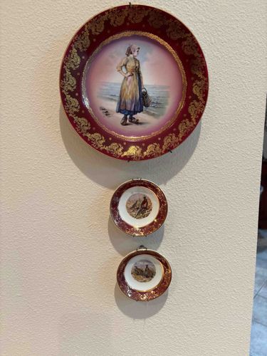 This set features a large, ornate porcelain display plate accompanied by two smaller miniature saucers, likely of European origin and dating to the late 19th or early 20th century. The central primary plate showcases a hand-painted portrait of a young woman in traditional peasant or coastal attire, standing on a beach and carrying a basket. The central tondo is framed by a soft pink gradient background, which transitions into a deep burgundy/maroon wide rim. This rim is heavily embellished with intricate 22k gold gilt filigree and rococo scrollwork. The two smaller pieces are miniature saucers featuring transfer-printed or hand-finished avian motifs (game birds) in the center, flanked by matching burgundy and gold decorative borders to create a cohesive set. The craftsmanship indicates a high level of decorative porcelain manufacturing common in factories located in France or Germany (such as Sevres or Dresden style). The condition appears well-preserved for its age, with strong pigment retention. There is evidence of minor gilt rubbing on the edges due to the use of metal spring hangars for wall mounting. No visible cracks or major crazing are apparent from the frontal view, though a light patina consistent with age is expected on the unglazed foot rings.