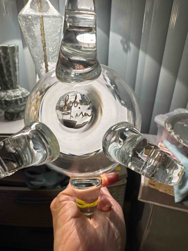 This is a hand-blown clear art glass object, likely a decorative sculpture or vessel from the mid-to-late 20th century. The piece is constructed from high-quality heavy lead crystal, showcasing exceptional clarity and light refraction. Its most distinguishing feature is a circular recessed pontil mark on the base, which contains an etched signature reading 'Boda' and 'Vallien', identifying it as a work by the renowned Swedish designer Bertil Vallien for the Kosta Boda studio. The design features thick, solid glass appendages or 'legs' flaring out from a central bulbous body, creating a tripod-like structure. The craftsmanship is evident in the smooth joining of the molten glass components and the absence of bubbles or inclusions. In terms of condition, the glass appears structurally sound with no deep chips or cracks visible in the primary body, though there is typical light shelf wear on the resting surfaces of the legs. The style is quintessential Scandinavian modern, characterized by a minimalist aesthetic that emphasizes the organic, fluid nature of the material. This specific etched signature suggests it may be part of an 'Artist Collection' or limited production run, making it a desirable piece for collectors of 20th-century Swedish glass design.