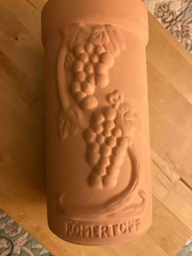 This is a vintage Römertopf wine cooler, specifically identified as a RECO 1993 edition. The item is a cylindrical vessel crafted from high-quality, unglazed terracotta, characterized by its natural porous texture and classic warm reddish-orange hue. The exterior surface features a heavy relief molding of two large, dangling grape clusters with vines and leaves, which is a signature design element for this brand. At the base, the name 'RÖMERTOPF' is prominently embossed in a serif typeface. The cooler functions through evaporative cooling; when soaked in water, the clay absorbs moisture and keeps wine chilled for extended periods. Its construction is robust with thick walls, standing approximately 8 to 9 inches tall, sized to accommodate a standard 750ml wine bottle. The condition appears to be excellent vintage state, showing a clean matte finish with no visible cracks, chips, or significant stains, which often occurs from hard water minerals or wine spills. The craftsmanship reflects the traditional German manufacturing standards of the Römertopf brand, which popularized this clay cooking and cooling method in the late 20th century.