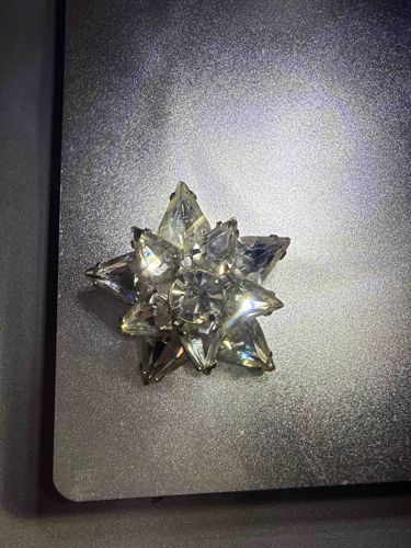 This is a vintage multi-tiered costume jewelry brooch featuring a starburst or snowflake design. Structurally, the piece is composed of a central round faceted rhinestone surrounded by two layers of pear-cut (teardrop) clear rhinestones set in a non-precious metal base, likely silver-tone pot metal or rhodium-plated brass. The upper tier consists of smaller pear-shaped stones angled inward, while the lower tier features larger stones extending outward to create the star points. Each stone is individually secured with visible metal prongs, a hallmark of mid-20th-century quality costume jewelry. The stones appear to be foil-backed glass which enhances their brilliance, although some yellowing or 'graying' is visible in certain stones, indicating age-related degradation of the foil backing or moisture infiltration. The overall construction is robust, utilizing a layered soldered frame typical of the 1950s or 1960s. No maker's mark is visible from the front view, but the craftsmanship is consistent with brands like Weiss, Eisenberg, or Trifari from the mid-century era. Minimal metal wear is present on the prongs, and the facets of the glass stones show light surface abrasions consistent with use.