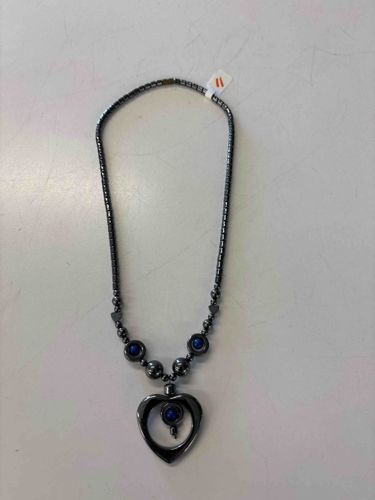 This necklace is composed primarily of polished hematite beads, characterized by their distinct heavy weight and metallic, gunmetal-grey luster. The strand features a variety of bead shapes including small cylinders, spherical spacers, and tiny heart-shaped accents located near the focal section. The central design incorporates larger hematite spheres flanking a large, open-heart pendant. This heart pendant contains a suspended central drop featuring a bright cobalt blue cabochon, possibly synthetic lapis or dyed stone, which is also echoed in two smaller stations on the flanking beads. The necklace appears to be strung on a flexible cord or wire, terminating in a magnetic clasp—a common feature for hematite jewelry of this style. The overall condition is good with light surface wear and minor scratching consistent with use. The piece reflects a contemporary style often found in wellness-oriented or artisanal craft jewelry from the late 20th to early 21st century. No visible maker’s marks are present. The craftsmanship is consistent with mass-produced or semi-handcrafted costume jewelry, utilizing the natural magnetic properties and high-shine finish of hematite for visual impact.