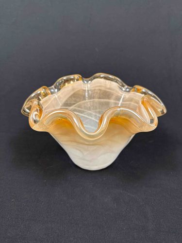 This is a handcrafted art glass bowl featuring an organic, scalloped, or 'ruffled' rim. The bowl exhibits a transitional color palette, moving from a translucent amber or golden-honey tone at the top rim to a milky, opaque white or cream color at the base. The construction appears to be hand-blown, evidenced by the fluid symmetry of the folds along the edge. The body is decorated with subtle, swirling wisps of white within the amber glass, creating a marbled or alabaster-like effect. It features a tapered, conical shape that rests on a polished or ground circular base. While no maker's marks are visible in the photograph, the style is reminiscent of mid-to-late 20th-century decorative glassware, possibly following in the tradition of Italian Murano or American studios like Fenton or Blenko, though it lacks specific identification. The glass appears to be in good vintage condition with no visible cracks or significant chips, maintaining a high-gloss finish. The craftsmanship is evident in the uniform thickness of the glass wall and the smooth, professional finishing of the undulations at the rim.