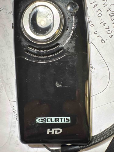 This is a Curtis brand HD pocket digital camcorder featuring a vertical, candy-bar style form factor reminiscent of early 2010s mobile video technology. The device is constructed from a glossy black polycarbonate plastic housing with silver-tone accents around the lens and a metallic top button. Technical specifications printed around the lens assembly indicate a 4x digital zoom capability with a focal length of F2.8/f=3.1mm. The front face includes the 'CURTIS' brand logo and an 'HD' designation in white lettering near the bottom. A small microphone port and a circular flash or LED indicator are visible near the lens. The lens itself appears to have some interior clouding or dust accumulation. The exterior casing shows significant signs of use, including heavy surface scratching, fingerprints, and localized wear to the glossy finish, particularly near the center of the body. There is a braided black wrist strap attached to the bottom of the unit. This type of entry-level consumer electronic was popular roughly between 2008 and 2012 before being largely superseded by integrated smartphone camera technology.