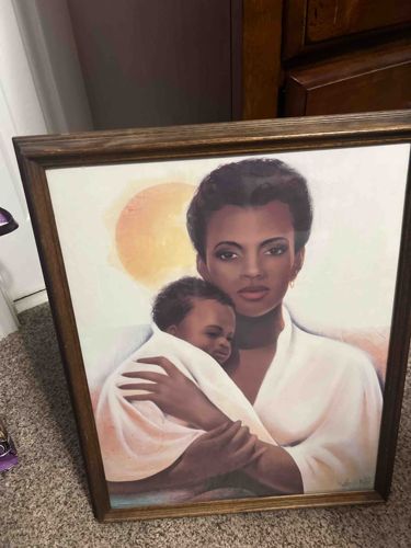This item is a framed decorative art print featuring a woman of African descent holding a young child, traditionally identified as 'The Promise' or similar works by artist Keith Mallett. The composition uses a soft, warm palette with a prominent yellow-orange sun in the background, contrasting against the woman's white garment and the rich, smooth skin tones of the subjects. The figure has short, dark hair, wearing small hoop earrings, with her hands delicately wrapped around a child swaddled in a matching white cloth. The style is representative of late 20th-century African American sentimental realism, likely dating from the 1990s. The piece is housed in a simple, dark brown wooden or laminate frame with visible mitered corners. While a signature is partially visible in the bottom right corner, it appears to be a printed element rather than an original hand-signature. The condition seems fair to good, with some minor scuffing on the frame edges and slight undulation in the paper behind the glass, suggesting it is a commercial lithographic print rather than an original painting. The craftsmanship is typical of mass-produced interior decor from its era, emphasizing emotional resonance and cultural heritage.