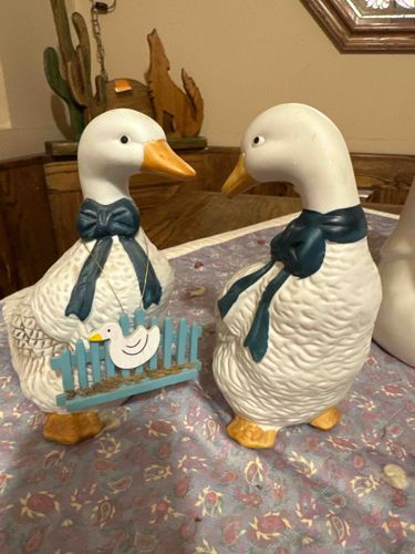 This is a pair of decorative ceramic figurines depicting anthropomorphic white geese or ducks, quintessential examples of the 'country kitchen' or 'shabby chic' aesthetic popular during the 1980s and early 1990s. Each figurine is constructed from molded ceramic with a textured, rippled surface designed to mimic feathering. The geese are finished in a matte white glaze with orange-yellow hand-painted accents on the bills and webbed feet. A primary distinguishing feature is the large, sculpted teal-blue ribbon tied in a bow around each neck. One goose is positioned looking forward while the other has a slightly tilted head, creating a complementary display. One figurine features a secondary accessory: a miniature blue picket fence plaque hanging from its neck with a small white duck icon, likely a later addition or a specific brand variant. The condition appears fair to good for the age, showing typical surface dust and minor shelf wear on the bases. There are no major visible chips or cracks in the primary photograph, though the matte finish is susceptible to scuffing. These are likely mass-produced decorative hobbyist pieces or giftware from companies such as Homeco or various ceramic mold distributors from the late 20th century.