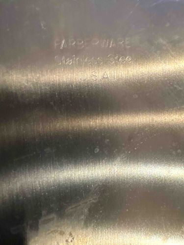 This item is a piece of stainless steel cookware, likely the bottom of a pot or skillet, manufactured by Farberware. The surface exhibits a brushed metal finish characteristic of mid-to-late 20th-century American kitchenware. The central focus is a clear, stamped maker's mark consisting of three lines of text: 'FARBERWARE', 'Stainless Steel', and 'USA'. The 'USA' designation suggests an era of domestic production, often associated with higher durability and thickness compared to later overseas versions. Physically, the metal shows a warm silver tone with visible circular machining marks across the surface. Regarding condition, the metal displays signs of frequent use, including numerous fine surface scratches, water spots, and small areas of heat tint or oxidation. There is a notable deeper scratch or abrasion at the bottom left of the frame. Despite these superficial wear patterns, the metal appears structurally sound with no evidence of warping or significant pitting. This piece represents typical mid-century modern industrial craftsmanship, valued for its utilitarian longevity. Based on the stamping style and 'USA' mark, this piece likely dates from the 1960s to the 1980s, a period when Farberware was a staple of American middle-class households.