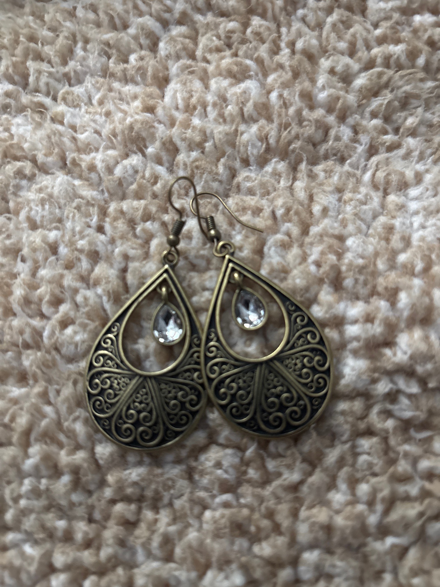 This pair of earrings features a teardrop-shaped dangle design with a decorative filigree pattern and a central faceted stone. Each earring is crafted from a gold-toned base metal with an antiqued or burnished patina finish that highlights the intricate scrollwork and floral-inspired detailing on the lower half. Within the open upper portion of each teardrop hangs a smaller, pear-cut clear faceted crystal or glass stone in a bezel setting. The earrings are suspended from simple fishhook (shepherd's hook) ear wires, which appear to be of the same metal composition. The construction suggests mass-market fashion or costume jewelry rather than fine jewelry, given the uniform cast details and the lack of hallmarks or precious metal markers. Condition-wise, the pieces appear intact with no missing stones and standard surface wear consistent with light use. The design aesthetic is contemporary Bohemian-chic, likely manufactured within the last ten years, inspired by traditional Indian or Moroccan jewelry motifs. The quality is indicative of standard retail boutique accessories, characterized by cast metalwork rather than hand-wrought filigree.