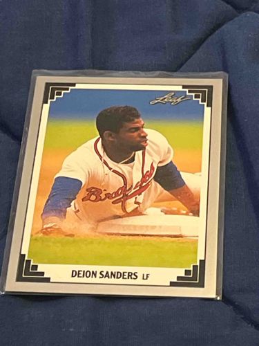 This is a 1991 Leaf Series 2 baseball trading card featuring Deion Sanders of the Atlanta Braves. The card measures the standard 2.5 by 3.5 inches and is printed on a high-quality, premium coated cardstock typical of the Leaf 'Gold' era. The design features a silver/grey border with art deco-inspired black geometric corner flourishes. The action photograph depicts Sanders sliding head-first into a base, wearing the classic Braves white home jersey with blue sleeves. The 'Leaf' logo is scripted in the upper right corner in gold-tone foil. The bottom white banner identifies the player as 'DEION SANDERS LF' in black block lettering. Regarding condition, the card is currently housed in a clear protective sleeve. From the visual evidence, the centering appears slightly biased toward the right border. The corners show sharp points without obvious blunting, and the edges appear clean with no major chipping of the silver ink. There are no visible surface scratches, creases, or print spots on the main focal area. This card represents a significant period in sports history when Sanders was a rare two-sport professional athlete, making it a staple piece of 1990s baseball memorabilia.