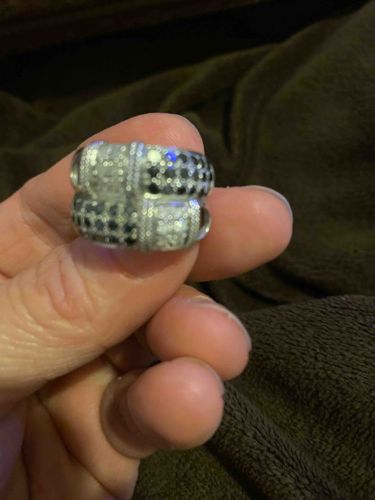 This item is a wide, dome-style band ring featuring a distinctive checkered or quaternary grid decorative pattern. The ring is constructed from a white-toned metal, likely sterling silver or white gold, and is heavily embellished with pave-set stones. These stones are arranged in four distinct rectangular quadrants on the face: two sections featuring clear white stones (likely diamonds or cubic zirconia) and two alternating sections featuring dark, black stones (likely black diamonds, onyx, or spinel). The borders between these quadrants are accented with fine milgrain-style beading, adding a vintage textural element to the modern geometric design. The ring has a substantial width, covering a significant portion of the proximal phalanx when worn, and tapers slightly toward the back of the band. In terms of condition, the metal surfaces show light superficial scratches consistent with gentle wear, but all stones appear to be present and intact without obvious chips. The craftsmanship suggests a contemporary fine jewelry piece, possibly from the late 20th to early 21st century, utilizing a high-density pave setting technique to maximize light refraction and contrast.