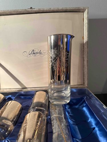 This is a mid-century modern cocktail set comprising a tall, cylindrical mixing pitcher and several matching tumblers, presented in its original silver-toned presentation box with a blue satin-lined interior. The glassware features a distinctive silver/mercury fade gradient, transitioning from a mirror-like metallic finish at the top to clear glass at the weighted base. Each piece is intricately decorated with an etched or silkscreened floral and filigree motif over the silvered section. The pitcher includes a pinched pouring spout. The set appears to be from the mid-20th century (circa 1950s-1960s), produced by 'Bauble,' as indicated by the stylized script branding on the inner lid. The glass is clear and of good quality with thick, stable bases. Condition-wise, the silver metallic coating shows slight signs of age and patina, but no significant peeling or oxidation is immediately visible in the image. The presentation box exhibits some age-related wear, including minor staining on the interior white panel. The inclusion of the original packaging significantly enhances its provenance and collectible value. Overall craftsmanship reflects the high-style entertaining aesthetic popular in the post-war era.