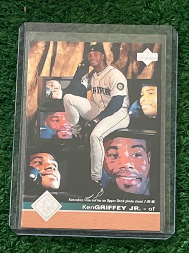 This item is a 1996 Upper Deck baseball trading card featuring Hall of Famer Ken Griffey Jr. of the Seattle Mariners. The card showcases a unique, collage-style design on the front, depicting Griffey in a Mariners home white uniform while surrounded by several television monitors displaying his image. A caption on the front reads, "Ken takes time out for an Upper Deck photo shoot 7-20-96," confirming the promotional nature of the shot. The card features high-gloss photographic printing typical of 1990s premium card stock. Notably, the bottom nameplate identifies him as "Ken GRIFFEY JR. - of" and includes the diamond-shaped Upper Deck logo. The card appears to be housed in a clear semi-rigid plastic top-loader for protection. Physically, the card displays sharp corners and no obvious surface flaws like creasing or staining, though the centering appears slightly biased towards the top. The color saturation is vibrant, reflecting the high-quality production standards of the Upper Deck Company during the mid-1990s. This specific card design was often used as a 'Trade' or checklist style insert rather than a standard base card.