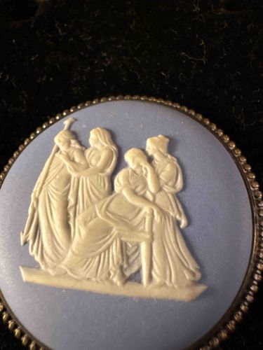 This is a circular Jasperware cameo, likely produced by the English manufacturer Wedgwood. The item features a high-relief white stoneware (bas-relief) application known as 'sprigging' set against a classic matte light-blue 'Wedgwood Blue' background. The scene depicts a classical Greco-Roman mythological or allegorical tableau featuring four figures in draped garments; one figure appears to be seated or reclining, attended by others in poses suggestive of solace or a narrative event. The craftsmanship of the application is delicate, showing fine details in the folds of the robes and the anatomy of the figures. The ceramic disc is held within a metal bezel, which appears to be silver-toned with a distinctive beaded or 'milgrain' decorative edge along the perimeter. Based on the style and construction, this piece likely dates from the late 19th century to the mid-20th century. The condition appears fair to good; the Jasperware surface shows minor dust accumulation in the crevices, and the metal frame exhibits a dark patina and slight irregularity consistent with vintage wear. There are no immediate signs of chips or cracks visible on the ceramic face, though the underside (not visible) would likely contain the characteristic impressed 'WEDGWOOD' and 'MADE IN ENGLAND' stamps common to these pieces.