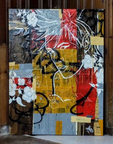 This is a large-scale contemporary mixed media work on canvas measuring approximately 1468 x 1874 mm. The piece features a complex, layered composition that combines elements of street art, graffiti, and floral pop art. The central focus is a stylized, white-line contour drawing of a human face with spiky hair, layered over a background divided into bold geometric blocks of red, yellow, grey, and black. The substrate appears to be built up with collaged materials, possibly newsprint or textured paper, visible beneath layers of acrylic and spray paint. Notable features include dripping paint effects, stencil-like white floral motifs distributed across the canvas, and a signature or street-style tag in the lower right corner that reads 'BARE'. The color palette is vibrant, dominated by cadmium yellow and deep crimson, contrasted with industrial greys. The construction shows intentional distressing, with masking tape-like rectangular patches adding to the urban aesthetic. The condition appears to be excellent for a contemporary work, with the rough textures and 'imperfections' like drips and frayed edges being integral to the artistic intent rather than actual damage. This piece reflects a 21st-century urban contemporary style, showing high-caliber craftsmanship in the balance of chaotic texture and clean line-work.