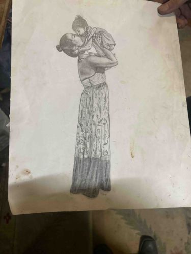This item is an original figurative pencil drawing on light-colored paper, depicting a sentimental scene of a mother holding her young child aloft. The artwork is rendered in graphite with a focus on realism, particularly in the shading and muscular definition of the mother's back and arms. The woman is shown wearing a long, patterned skirt with a dark hem, while the child appears in a simple dress or romper. The technique utilizes varying degrees of pencil hardness to create depth, from the cross-hatched patterns on the clothing to the smooth tonal gradients of the skin. The paper exhibits significant signs of age and wear; there are several visible brown foxing spots and stains scattered across the surface, particularly on the left side and center-right. The edges of the paper show slight creasing and curling, suggesting it has been handled without a frame for some time. There are no clearly visible artist signatures or dates on the front of the work. Based on the contemporary hairstyles and clothing style, the piece likely dates from the late 20th to early 21st century. The craftsmanship is skilled, demonstrating a strong grasp of human anatomy and textile movement.