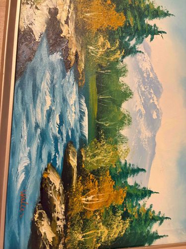 This is an original oil painting on canvas, oriented vertically, depicting a serene mountain landscape. The artwork is executed in a heavy impasto technique, where thick layers of paint are applied to create a tactile, three-dimensional surface. The composition features a rushing blue and white river in the foreground on the left, flanked by rocky outcroppings rendered in dark browns and ochre. To the right and center, a dense forest of coniferous and deciduous trees is depicted in vibrant shades of forest green, lime, and autumnal yellow. In the background, a large, snow-capped mountain peak rises under a pale blue and white sky. The painting is signed in the lower-left corner with the name 'Walter' in a stylized, cursive red script. The work is housed in a simple, thin metallic frame, likely aluminum or silver-toned wood. Stylistically, the piece reflects the mid-to-late 20th-century decorative art movement, reminiscent of the 'wet-on-wet' technique popularized by television painters like Bob Ross or Bill Alexander. The colors are bright and saturated, and the brushwork is quick and expressive. The condition appear good with no visible craquelure, paint loss, or sagging of the canvas, though some minor dust accumulation is present in the impasto ridges. There are no obvious signs of restoration or repair.
