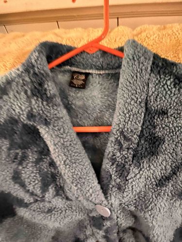 This garment is a contemporary open-front jacket or cardigan, appearing to be crafted from a heavy-weight polyester sherpa or faux shearling fleece material known for its high-pile, nubby texture. The color palette features a tonal tie-dye or 'cloud' dye effect in varying shades of slate blue, charcoal grey, and muted denim tones. The jacket features a wide shawl-style collar and a single oversized button closure at the waist, which appears to be made of a smooth, grey-toned plastic or resin. An internal brand tag at the neckline clearly identifies the brand as 'Earthbound,' a contemporary lifestyle retailer. The interior of the garment is unlined, showcasing the reverse side of the fleece fabric. The construction appears sturdy with standard industrial serged seams. In terms of condition, the item shows signs of moderate wear typical of high-pile synthetic fabrics, including some minor matting or 'pilling' of the fibers at friction points. The overall aesthetic is rustic and bohemian, likely dating from the mid-to-late 2010s. It represents a common high-street retail item designed for comfort and casual cold-weather layering.