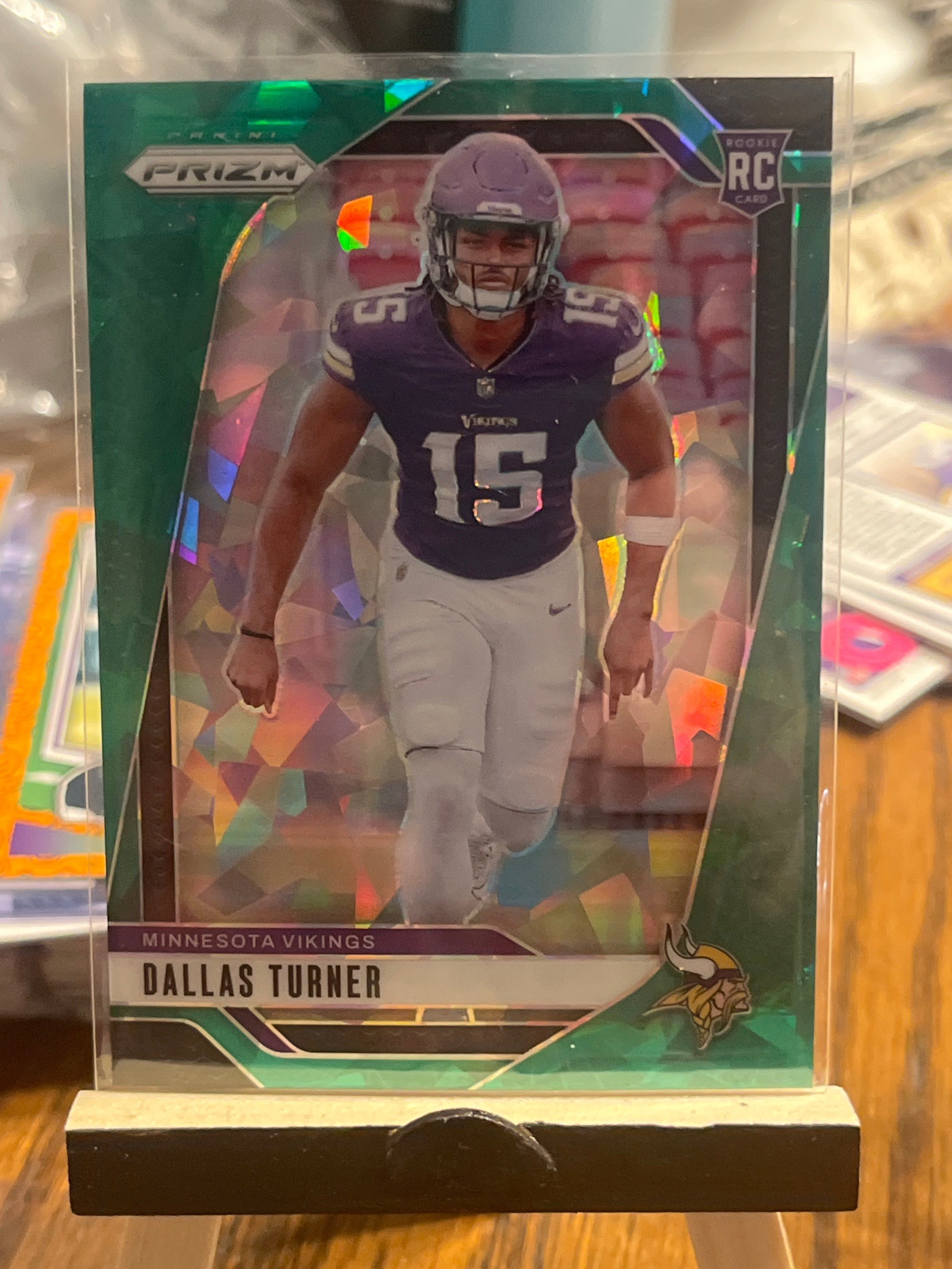 This is a 2024 Panini Prizm football trading card featuring Dallas Turner of the Minnesota Vikings. The card is categorized as a ‘Rookie Card,’ indicated by the 'RC' shield icon in the upper right corner. It features the 'Green Pulsar' Prizm parallel, characterized by a vibrant green border and a fractured, prismatic background texture that creates a multi-colored shimmer when exposed to light. Turner is depicted in a full-action shot wearing his purple and white Minnesota Vikings uniform with jersey number 15. The card includes the official Panini Prizm branding in the upper left and the Minnesota Vikings team logo in the lower right. Physically, the card appears to be in excellent condition, housed within a protective clear plastic sleeve. The centering appears slightly heavy toward the left side, but the corners and edges visible through the sleeve seem sharp and free of major dings or whitening. The surface does not show any prominent scratches or dimples in the high-gloss finish. This modern sports collectible represents a high-demand parallel for a first-round defensive draft pick, produced with Panini's signature opti-chrome technology which ensures a rigid, premium card stock and a high-quality holofoil finish.