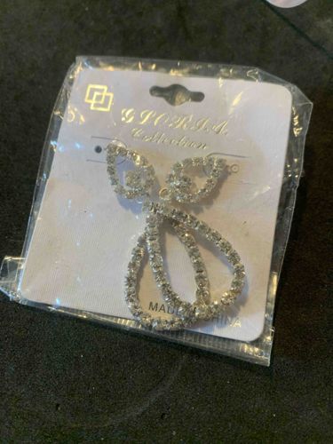 This item is a single costume jewelry earring or jewelry component featuring a tiered, open-work pear and scroll design. The piece is constructed from a non-precious white metal base and is heavily embellished with small, round, brilliant-cut clear glass rhinestones or crystals, which are individually set in a classic prong or cup-chain style. The upper portion consists of two smaller, open-loop floral or flame-like motifs, while the lower section features two overlapping, elongated teardrop shapes. The item is currently displayed on its original white 'Gloria Collection' branded cardstock backing and is encased in its original clear plastic retail adhesive polybag. Based on the branding and the 'Made in China' text visible at the bottom of the card, this is a contemporary, mass-produced fashion accessory likely dating from the 21st century. The condition appears to be new-old-stock (NOS) or unused, with all rhinestones present and no visible oxidation or tarnish to the metal plating through the packaging. The craftsmanship is typical of high-volume costume jewelry, prioritized for visual brilliance and formal aesthetic rather than high-value materials.