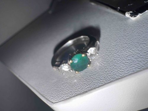 This item is a classic three-stone ring, often referred to as a 'trilogy' ring, featuring a central faceted round emerald flanked by two round brilliant-cut diamonds. The emerald displays a saturated, medium-dark green hue with visible natural inclusions, which is characteristic of the gemstone. The side diamonds appear to be of a high color grade, providing a sharp contrast to the central stone. The setting is likely composed of platinum or white gold, indicated by its bright silver-toned finish. The stones are secured by multi-prong settings, with the emerald appearing to have yellow gold prongs, a common technique used to enhance the green color of the stone. The band is a polished, substantial shank that tapers slightly toward the head of the ring. Regarding condition, the metal shows minor surface abrasions and signs of light wear consistent with age, but no major structural damage is visible. The craftsmanship suggests a high-quality contemporary or late 20th-century manufacture, aimed at emphasizing the vibrancy of the primary gemstones through a balanced, symmetrical design.