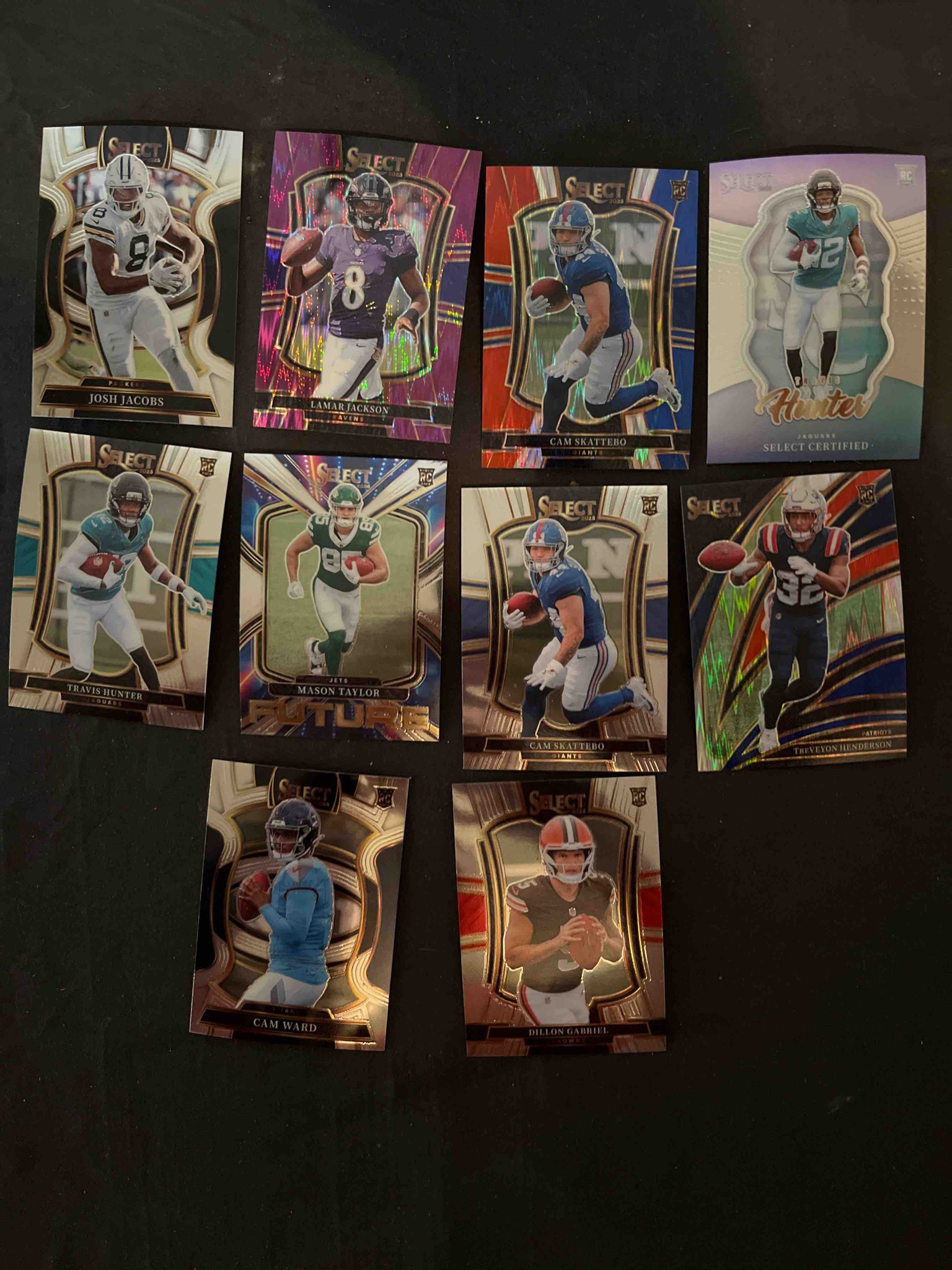 This is a collection of ten modern football trading cards from the Panini 'Select' product line, dated between 2023 and 2025. The collection features a variety of standout players including Lamar Jackson, Josh Jacobs, and several highly-touted 'Rookie Card' (RC) prospects like Travis Hunter, Cam Ward, and Dillon Gabriel. The cards are constructed of high-gloss, premium cardstock with a metallic 'chrome' finish. The lot contains multiple parallel styles: a purple 'shimmer' or 'prizm' style for Lamar Jackson, a 'Select Certified' insert for Travis Hunter, and multiple 'Concourse' or 'Premier Level' base and parallel variations. Notable holographic/prizm elements are visible on the TreVeyon Henderson and Lamar Jackson cards, which refract light into rainbow patterns. The condition of the cards appears to be 'raw' and un-graded; while general surface quality looks high with sharp colors, several cards (notably the Travis Hunter on the far right and those on the bottom row) exhibit a noticeable 'curl' or 'bowing,' which is a common manufacturing characteristic of chrome-style cards but can impact surface grading. There are no immediate signs of corner softing or surface scratching visible at this resolution, but minor edge wear is typical for this brand. Many of the cards feature the 'RC' shield, indicating they are from the players' official rookie cycles, often a primary driver of market value for modern collectors.