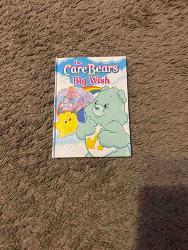 This is a vintage-style hardcover children's storybook titled 'The Care Bears Big Wish'. The cover features a vibrant illustration of Wish Bear, a light aqua-colored bear with a yellow star and shooting star 'belly badge', prominently displayed in the foreground. Accompanying the bear is a yellow star character and a pink cloud-mobile-style vehicle in the background against a blue sky with fluffy white clouds and a rainbow. The title 'The Care Bears' is rendered in its classic 1980s-inspired red and white typography, with 'Big Wish' appearing below in a smaller pink font. Physically, the item is a rectangular, thin-format hardcover book with a white spine and glossy finish on the cover art. Based on the character design which aligns with the mid-2000s revival of the franchise (specifically the 2005 CGI film 'The Care Bears' Big Wish Movie'), this book is likely a tie-in publication from that era. The condition appears to be very good with sharp corners, no visible fraying on the spine, and clear, unfaded colors, though some minor shelf wear on the edges and light surface scratching on the gloss may be present upon closer inspection. The binding appears tight and intact. These books were typically mass-produced paper-over-board products designed for durability in a domestic setting.