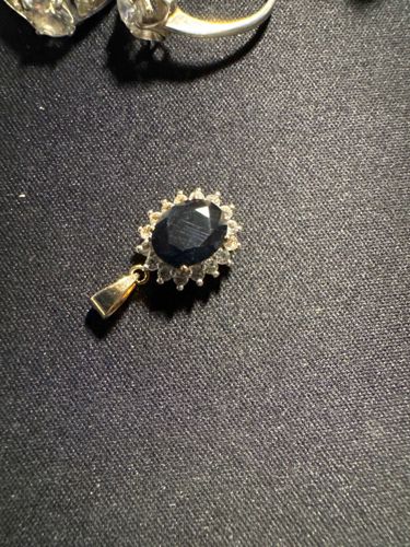 This jewelry piece is an elegant oval-cut pendant featuring a central deep navy blue gemstone, likely a sapphire, estimated at approximately 1.5 to 2 carats based on visual scale. The primary stone is set within a traditional halo cluster composed of fourteen small, round-brilliant accent stones. These accent stones are clear, appearing to be diamonds or high-quality cubic zirconia, and are individually secured by small metal prongs. The pendant mounting is constructed from a yellow metal, presumably 10k or 14k yellow gold, which provides a warm contrast to the cool tones of the sapphire. The bail is a tapered, polished yellow gold loop attached to a small jump ring at the top of the pendant head. The design is characteristic of late 20th-century fine jewelry, specifically the 1980s or 1990s, inspired by the iconic 'Diana' style royal sapphire cluster. Regarding condition, the central sapphire shows visible surface abrasions and minor facet wear, suggesting a history of frequent wear. There is a slight patina on the yellow gold bail, and the accent stones appear intact without missing elements. No visible maker's marks are present in the provided angle, though they would typically be located on the interior of the bail or the reverse of the gallery. The craftsmanship exhibits standard commercial jewelry quality with a focused emphasis on the contrast between the dark primary stone and the shimmering halo.