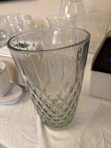 This item is a clear pressed glass vase featuring a tapered, conical silhouette that flares gently from the base to the rim. The exterior ornamentation consists of two distinct decorative zones: the lower two-thirds of the body are covered in a dense, raised diamond-point or hobnail-style geometric texture, while the upper third transitions into vertical fluting or ribbing that extends to a smooth, rounded fire-polished rim. The glass appears to be of standard commercial grade, likely manufactured through a glass pressing mold process rather than hand-blown, evidenced by the uniformity of the geometric pattern. The material exhibits a slightly grayish or cool tint typical of soda-lime glass, with no immediately visible high-end lead crystal refraction. Condition-wise, the vase appears to be in good used condition with no large structural cracks or chips visible at the rim; however, typical light shelf wear on the base and minor surface scratches from handling and cleaning are probable. The style is reminiscent of mid-to-late 20th-century floral industry glassware or mass-produced home decor, often categorized as Neo-Deco or traditional utility glass. There are no visible maker's marks, signatures, or acid-etched stamps apparent in the image, suggesting a utilitarian origin.